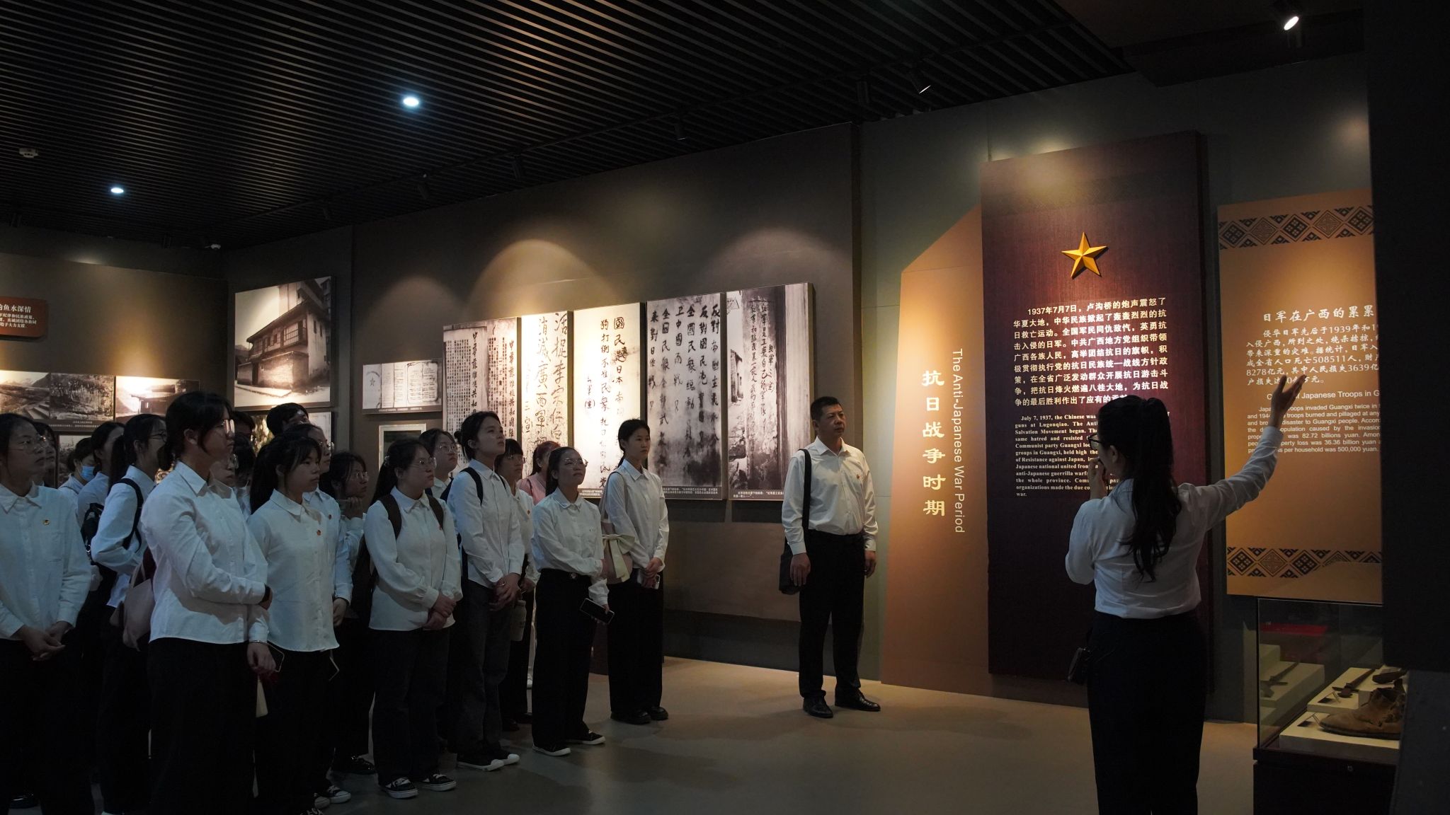 活动伊始,在庄严的国歌声中,全体人员肃立,向烈士纪念碑敬献鲜花,以表达对烈士们的崇高敬意和深切缅怀之情。随后,在讲解员的细致引导下,同学们逐一参观了新民主主义革命、土地革命、抗日战争、解放战争四个时期的广西革命史展厅。在讲解员生动的解说下,同学们仿佛穿越历史长河,亲身感受了广西军民在中国共产党的领导下,英勇奋战、不畏牺牲的壮丽历史画卷。