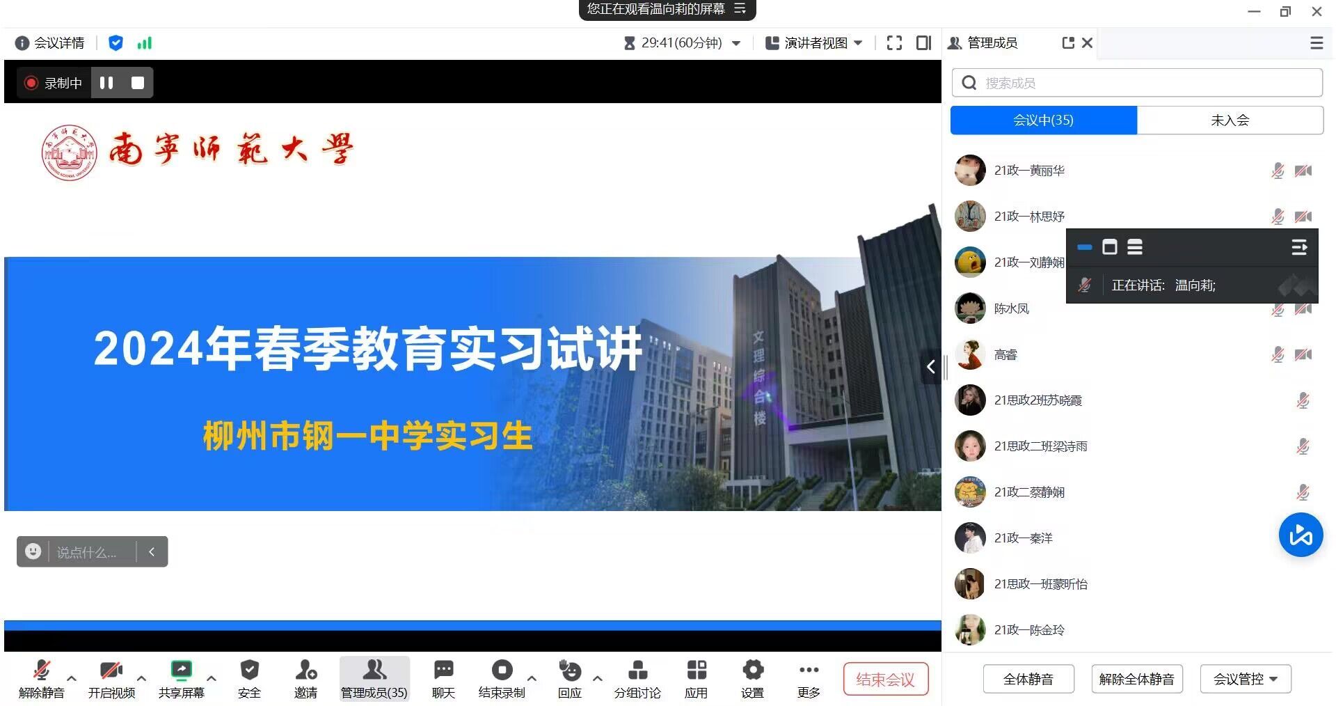 就已经启动2021级思想政治教育专业师范生的校内教育实习工作,并结合实际情况采取线上线下相结合的方式开展校内实习,即寒假期间采取线上试讲,本学期开学后集中组织线下试讲。