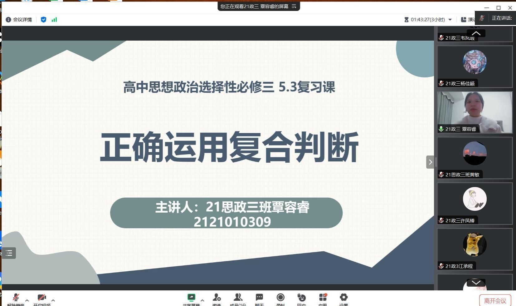 寒假期间,2021级全体同学开展了线上试讲,校内实习指导老师线上点评,同时也邀请了2020级同学为2021级同学传授实习经验、热心答疑解惑,从教材解读、课件制作、授课状态以及各实习学校的相关情况等进行了细致介绍。