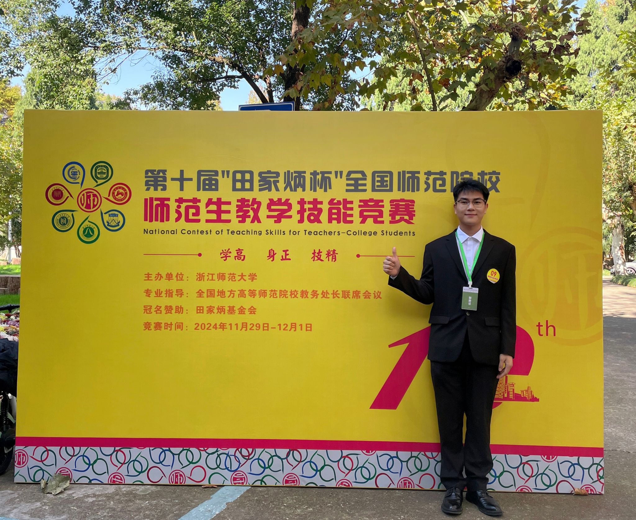 本次大赛从2024年9月启动,历时3个月,分为初赛(教学设计、模拟教学、说课)与决赛(120分钟内完成1课时教学设计、1课时多媒体课件制作、3分钟即席演讲、10分钟模拟上课)两个阶段。为了做到充分的备赛,徐欣、冯舒讌两位老师于今年6月开始进行备赛训练,前期主要针对教学理念确立、教学重难点把握、教学内容处理、教学方法整合、教学创新设计等方面开展了十余次的模拟训练,并就参赛选手的表现进行了认真细致的指导;后期根据决赛的要求,增加即席演讲方面的训练,同时继续加强教学层面的训练。正是在一次次的严格训练与反复打磨下,李铭豪同学在比赛过程中展现出良好的专业素养与扎实的教学技能,从容应战,最终斩获佳绩。