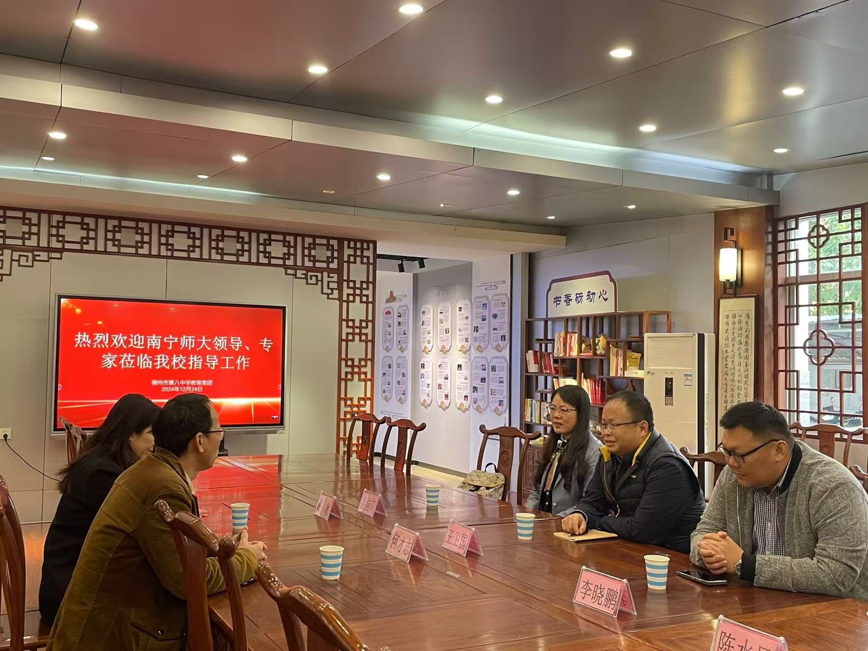 在柳州八中,该校党委书记何才志、副校长谢敏热情接待了学院一行人。何书记详细介绍了学校的发展历程、办学理念、办学特色等情况,双方表示将遵循“共学、共享、共教、共研、共育”的理念,致力于构建全方位、多层次深度合作关系。