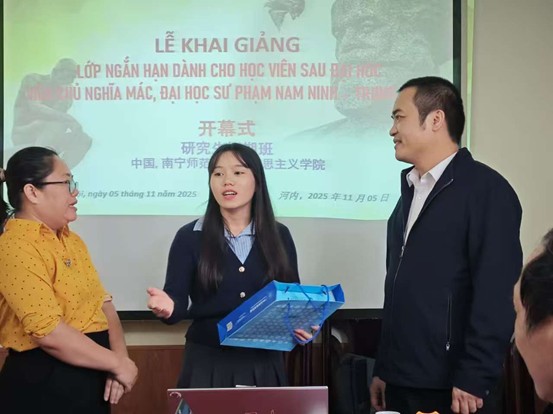 开幕式上,河内国家大学所属社会科学与人文大学哲学系范黄江院长在致辞中对访学研修团的到来表示热烈欢迎,他回顾两校前三届交流团互访经历,指出今年是两校第四次派学生代表团开展互访,这持续深入的交流不仅巩固了双方在马克思主义理论研究与教学领域的合作,更在实践中为两国青年学子搭建了友谊之桥。他希望全体学员珍惜研修机会,深入交流研讨,并承诺学校将周密组织、全力保障,提供优质教学资源与研讨讲座,确保培训取得圆满成功。