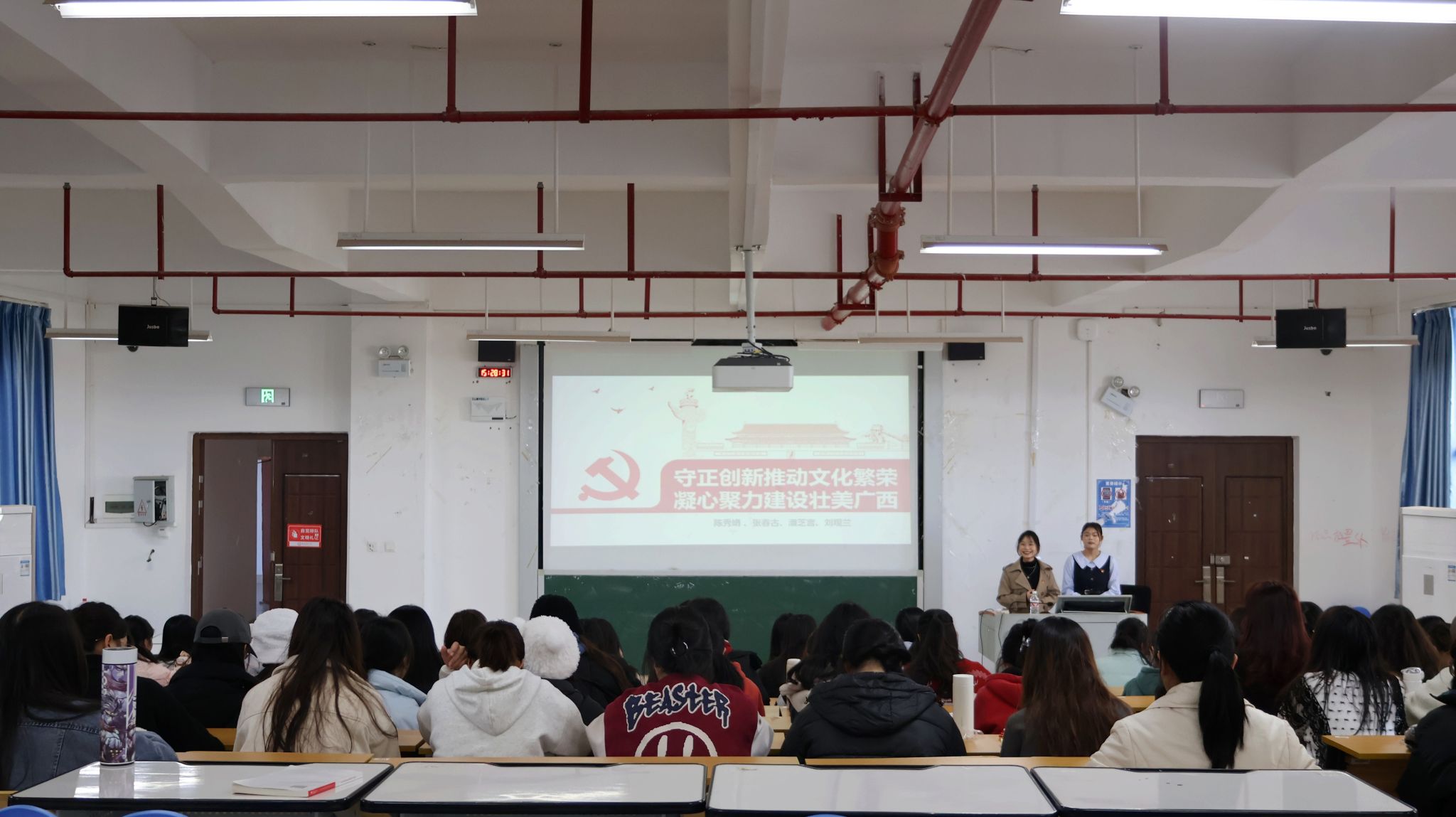 其次,由主讲人张春古、陈秀娟讲述以“守正创新推动文化繁荣,凝心聚力建设壮美广西”为主题的团课。主讲人以广西的各特色民族文化作为切入点,并通过“广西文化的发展在现如今呈现出怎样的新形式”的问题来引入课堂。紧接着主讲人列举出了文化创新的几个例子,并指出要坚持以习近平文化思想为指引。