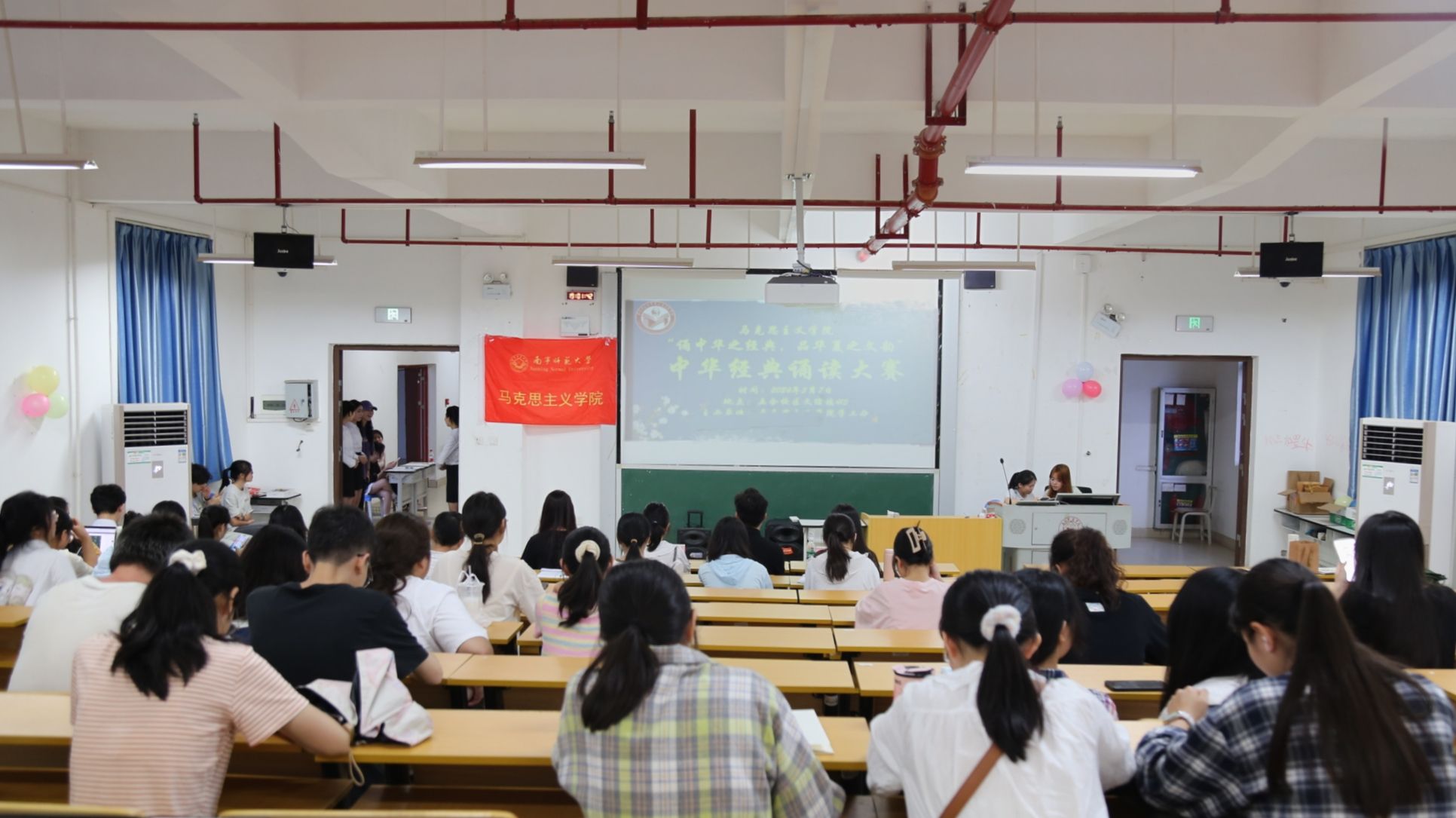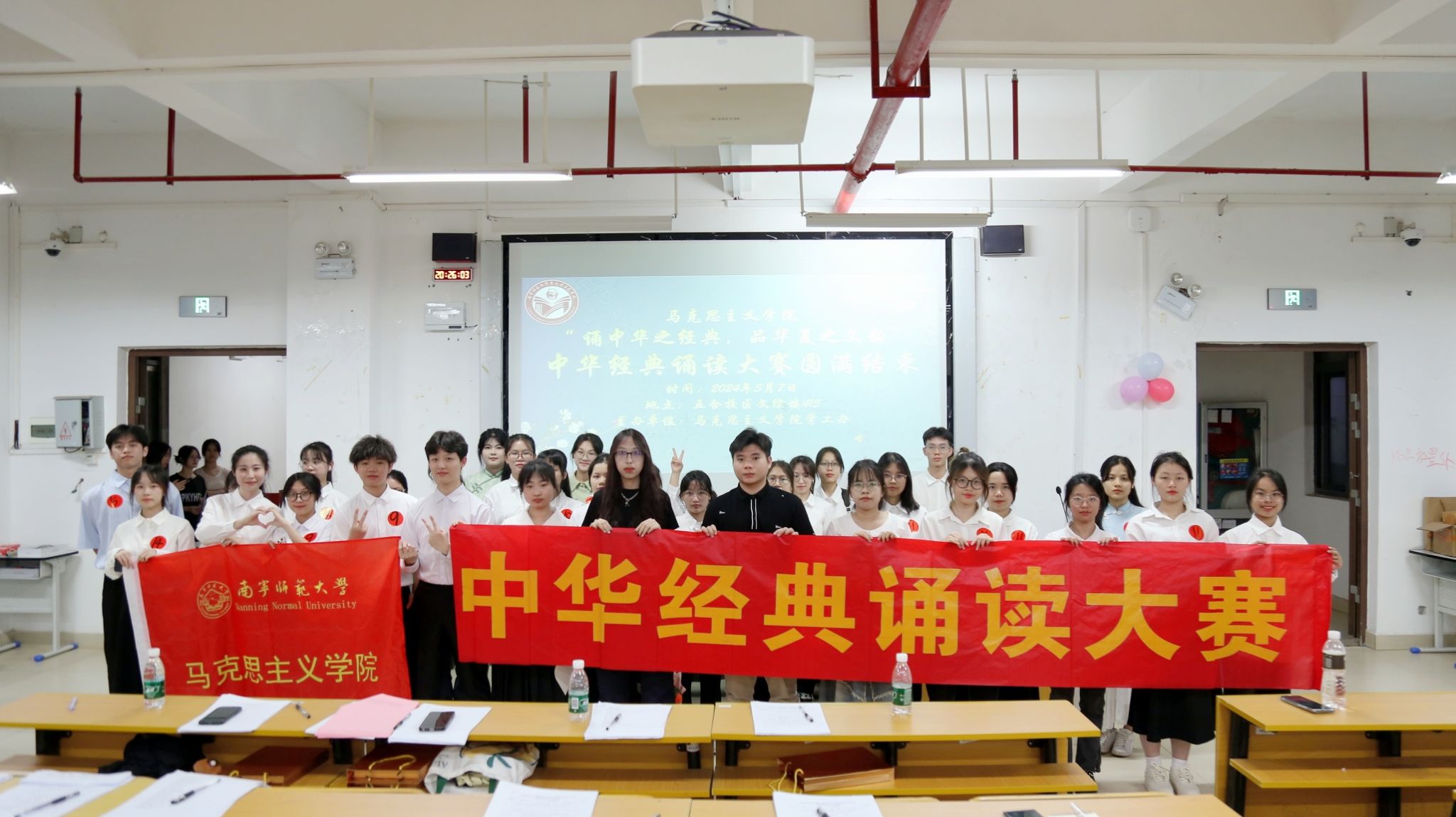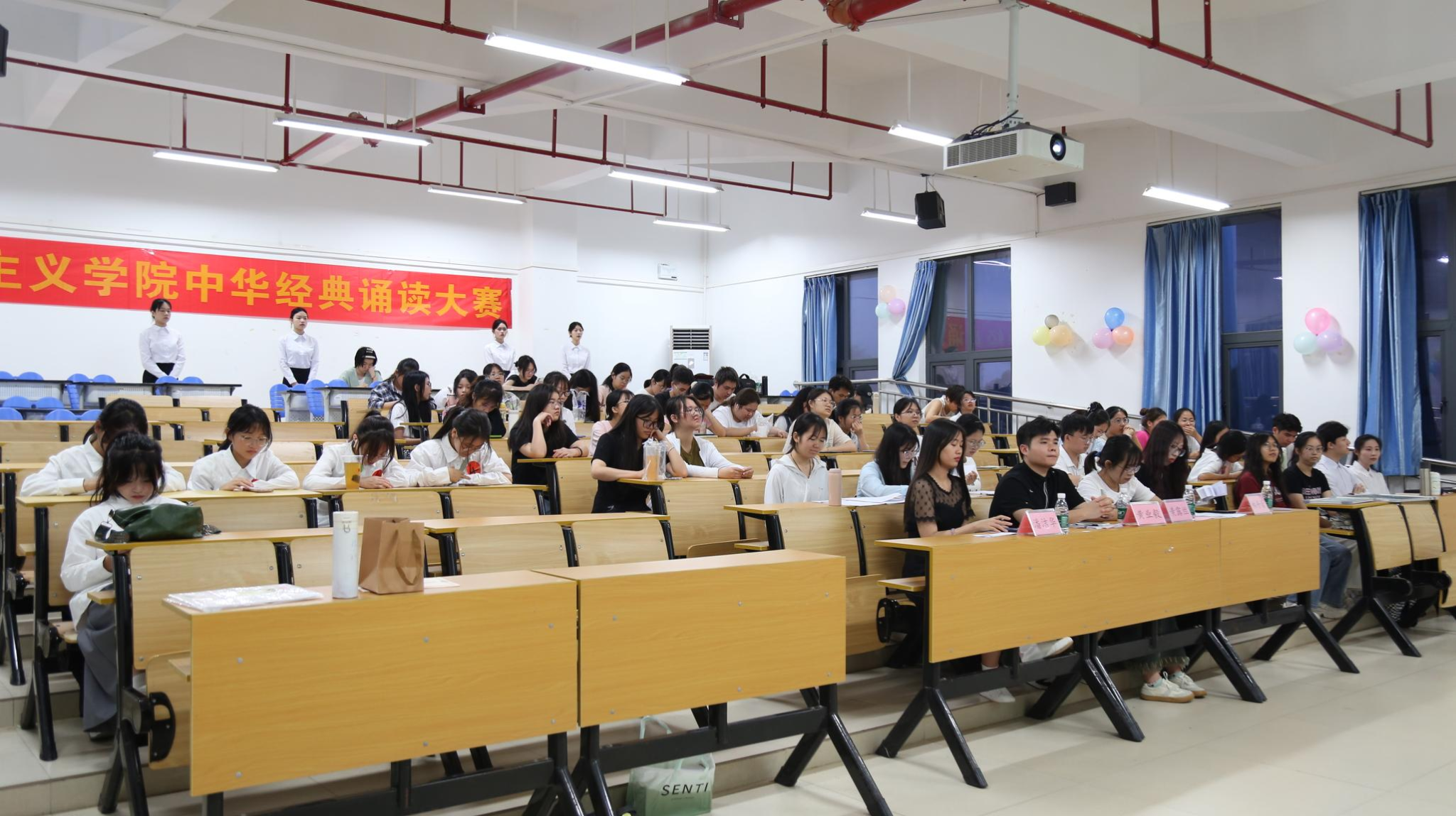 2024年中华经典诵读大赛院级初赛。出席此次大赛的人员有辅导员黄业毅、兼职辅导员黄露丝、办公室负责人潘洁华、宣传部负责人林丹蕾以及大众评审和各班级代表。