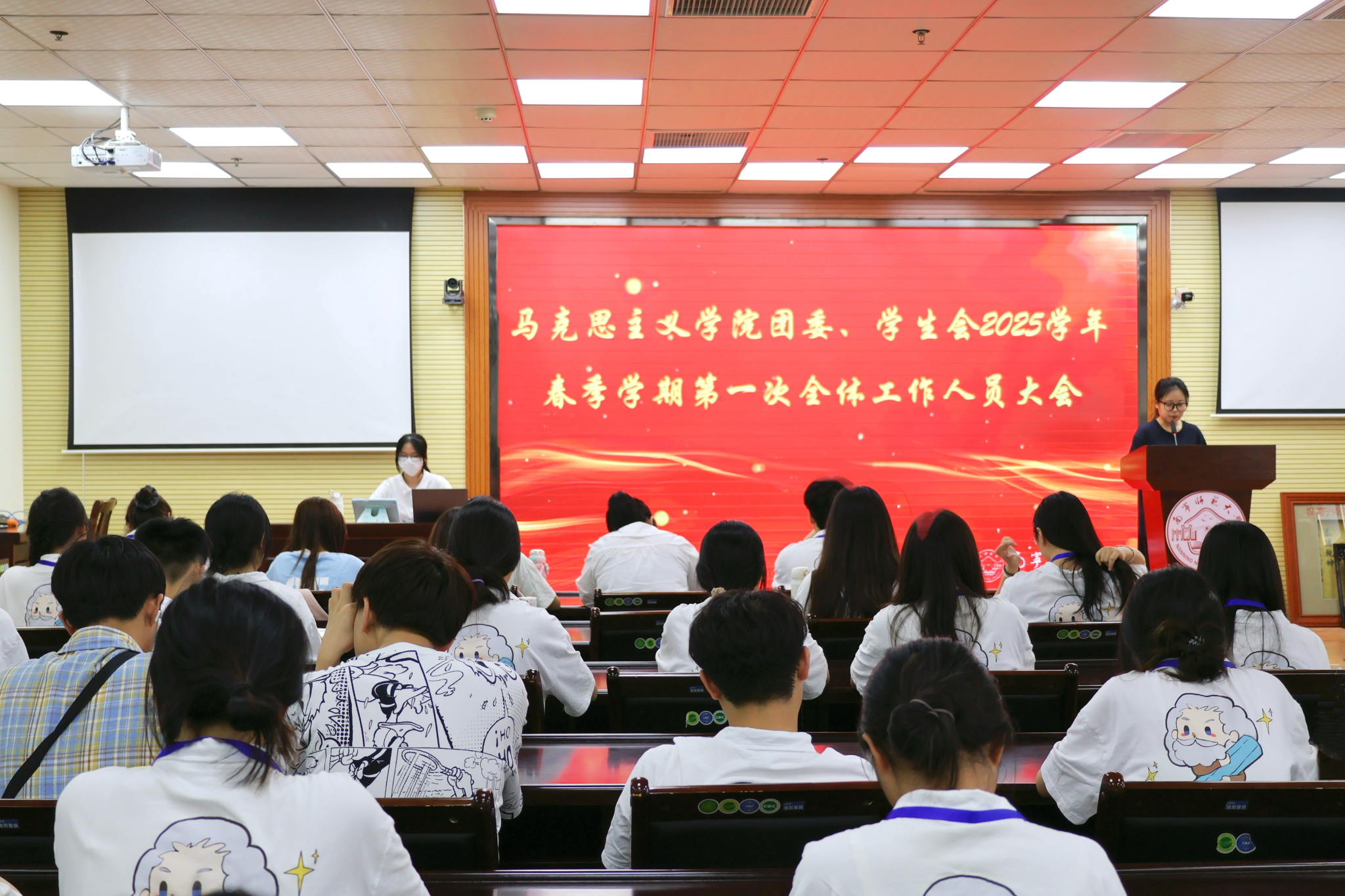 于4月10日下午17点在8栋B座215报告厅召开学院团委、学生会2025年春季学期第一次工作人员大会。学院团委书记韦旖扬老师、学生会主席团成员周汉林、团委办公室负责人廖美婷、团委组织部负责人李佳璇、团委宣传部负责人彭昕阳、各部门负责人及工作人员参加本次会议。