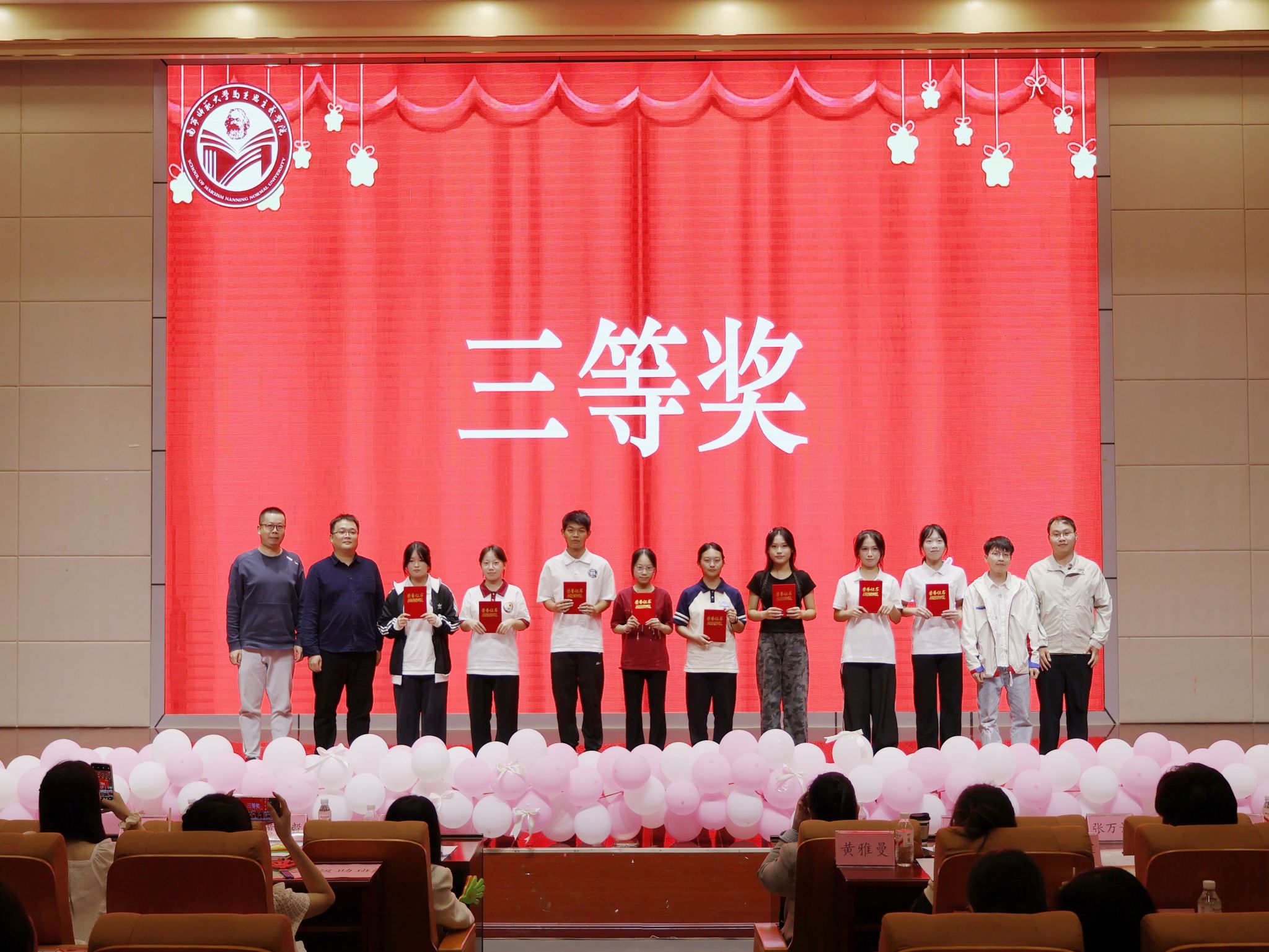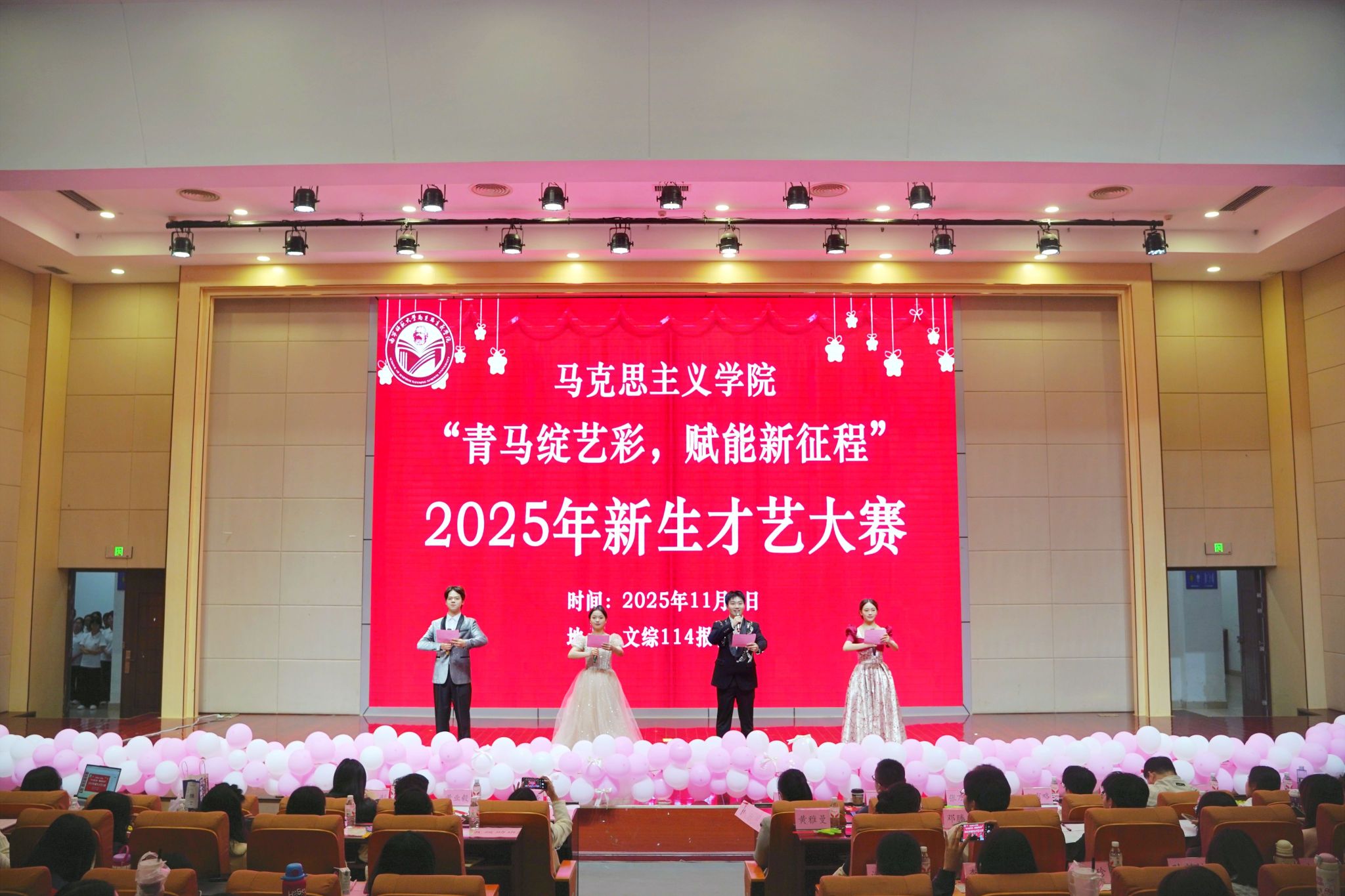 于11月9日晚在五合校区文综114报告厅举办“青马绽艺彩,赋能新征程”2025级新生才艺大赛决赛。参与本次活动的有学院团委书记韦旖扬、辅导员王玉香、黄业毅、李夏彤,2025级各班班主任和助班、各学生代表以及2025级全体本科生。