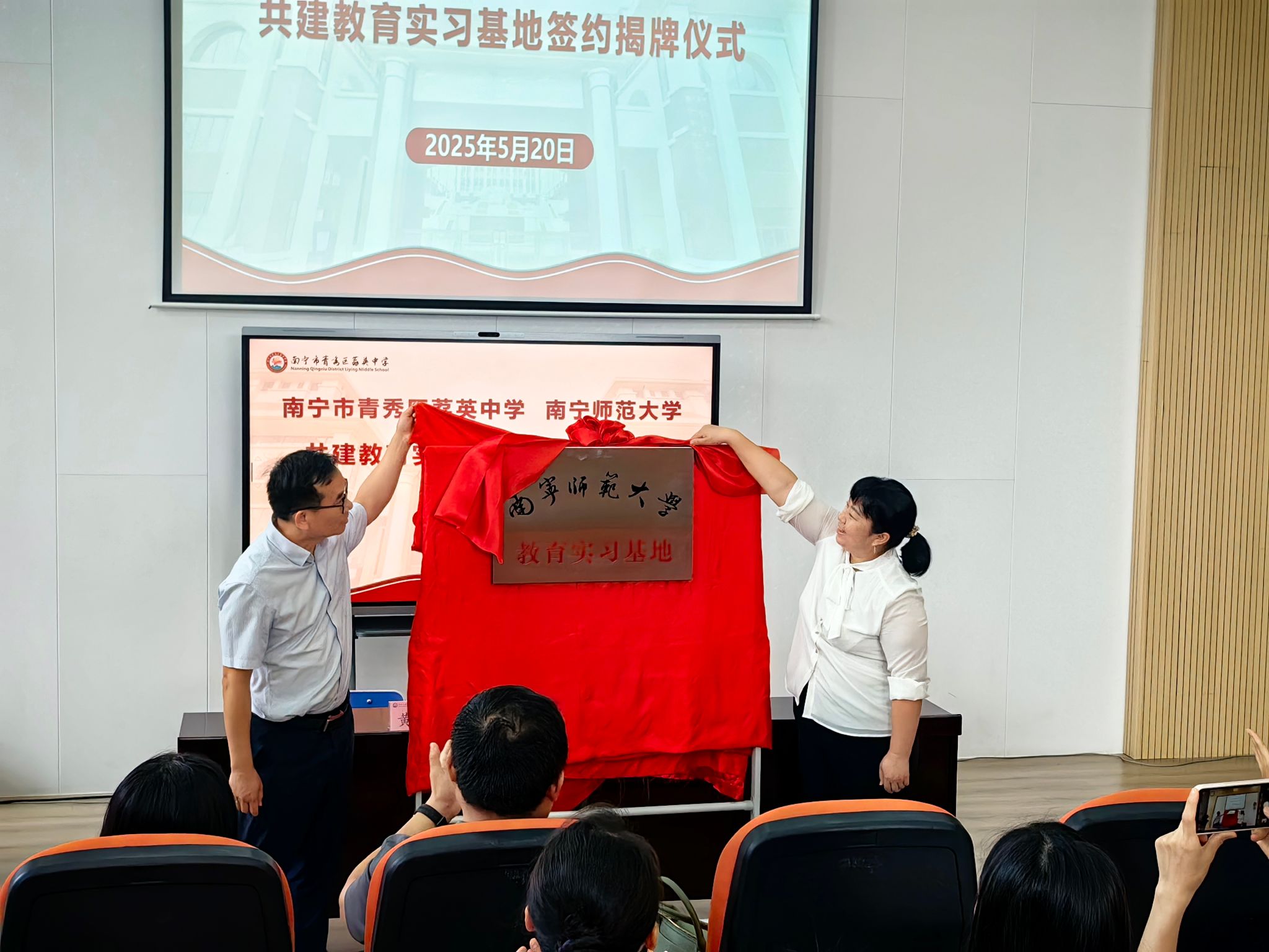 啪啪网 党委书记李玲与南宁市青秀区荔英中学校长黄道振签订教育实习基地协议书,并为“啪啪网 教育实习基地”揭牌。双方就思想政治教育专业人才培养、师资建设、教学成果培育等方面进行深入交流,一致达成深入合作意向。