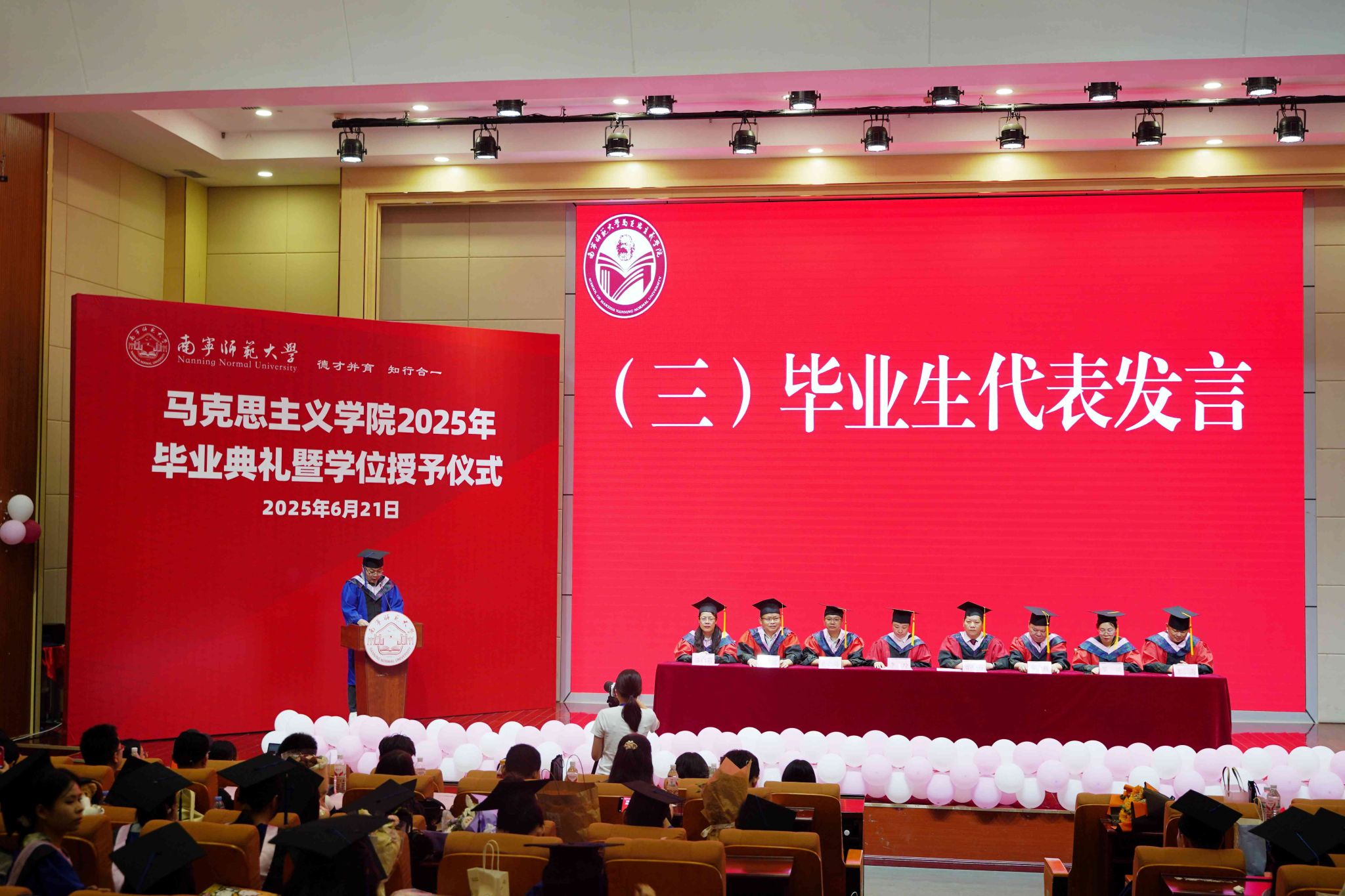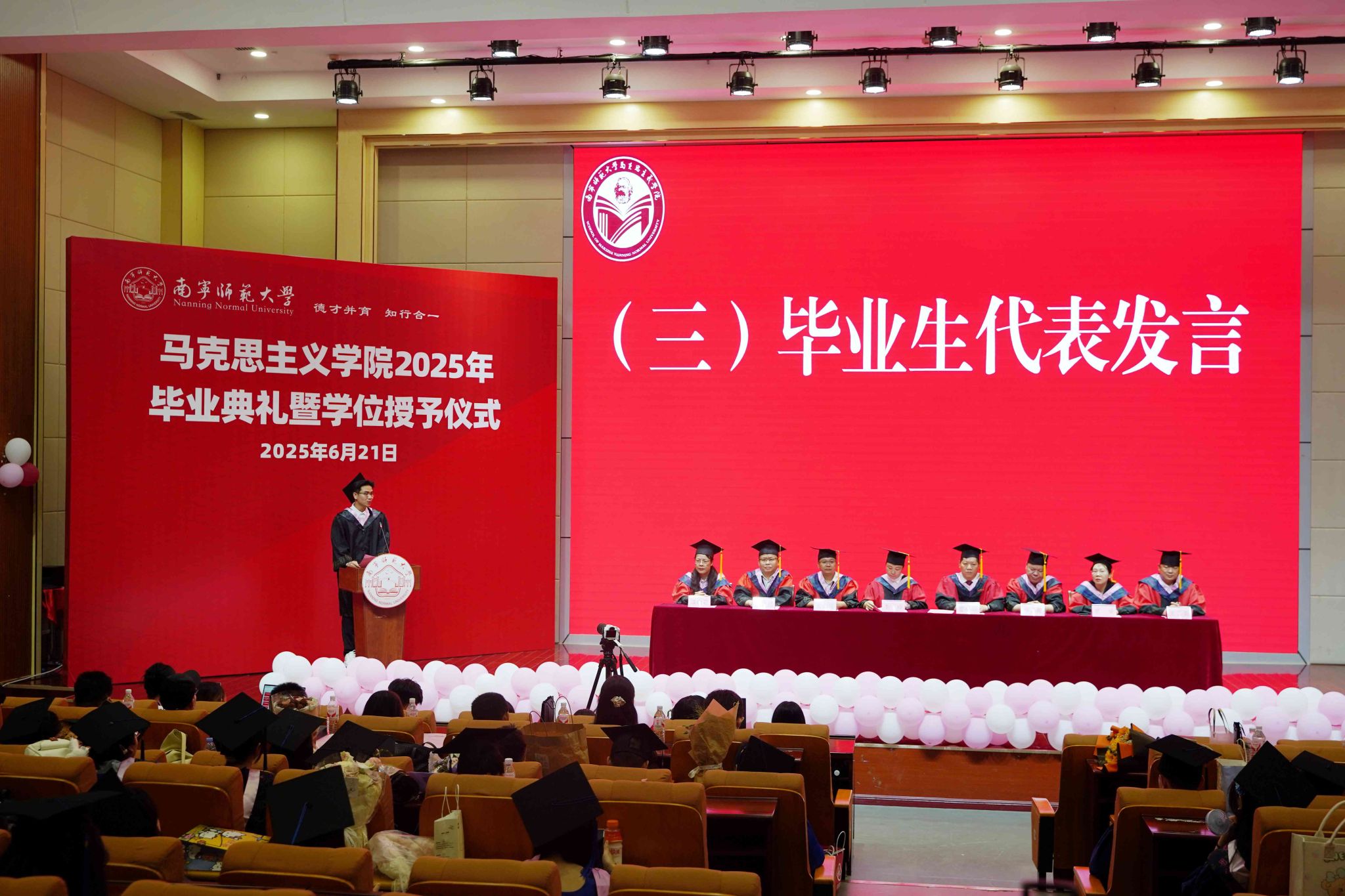 2025届硕士研究生优秀毕业生代表赵鑫和本科优秀毕业生代表李铭豪先后上台发言,分享了在校学习与成长的经历,表达了对母校、师长和同窗的感恩之情以及对未来的憧憬与决心,激励着在场的每一位毕业生。