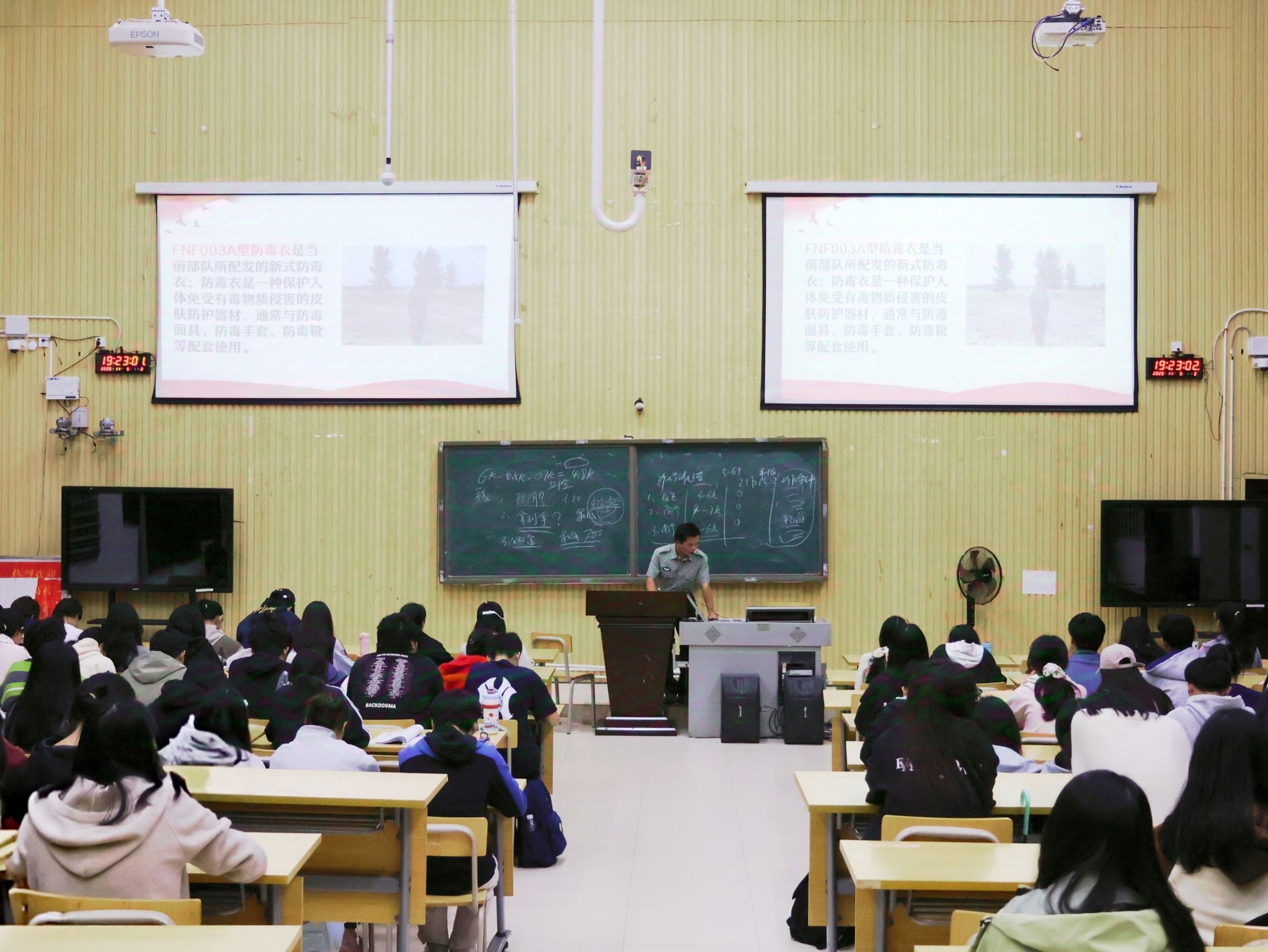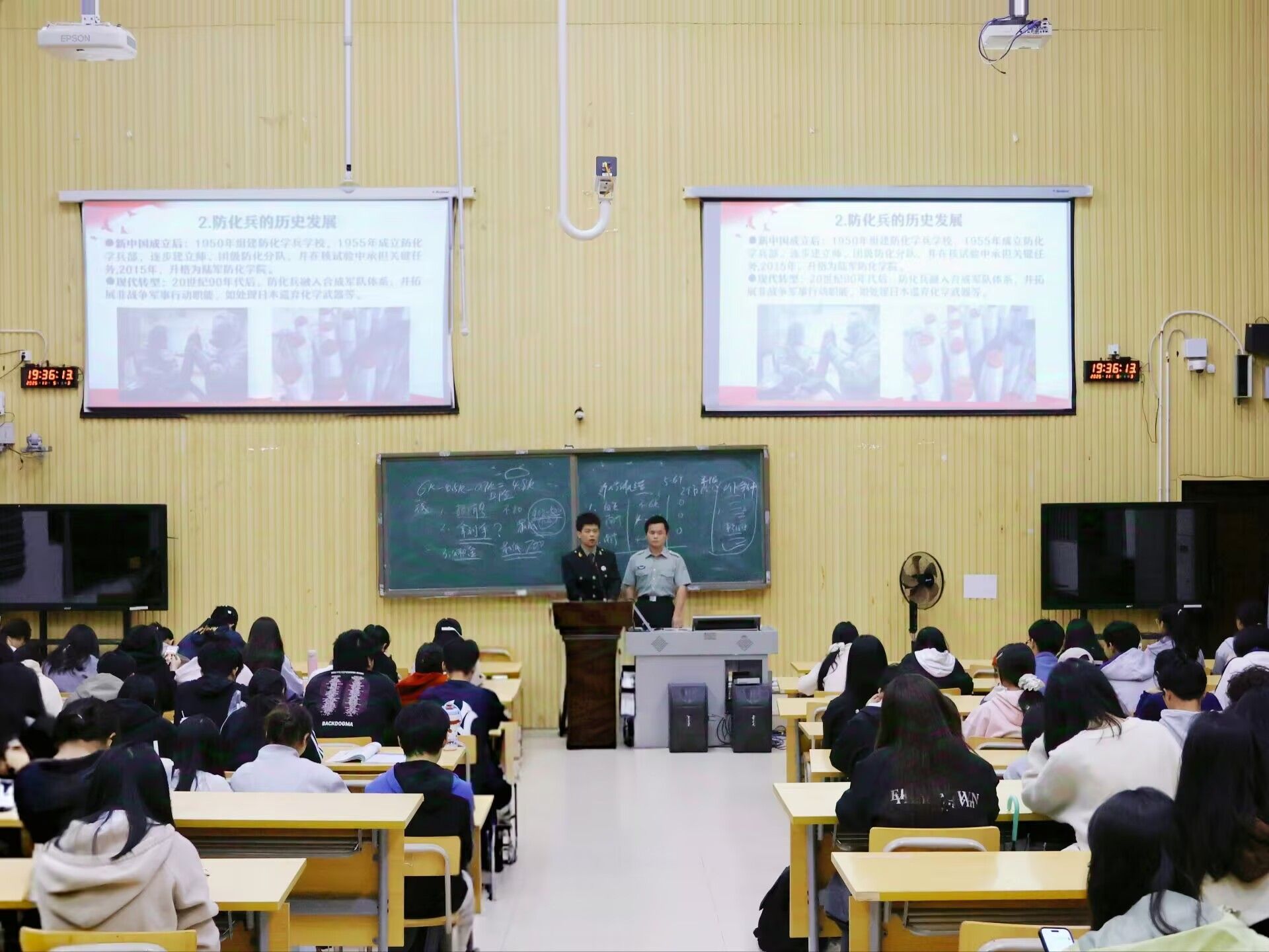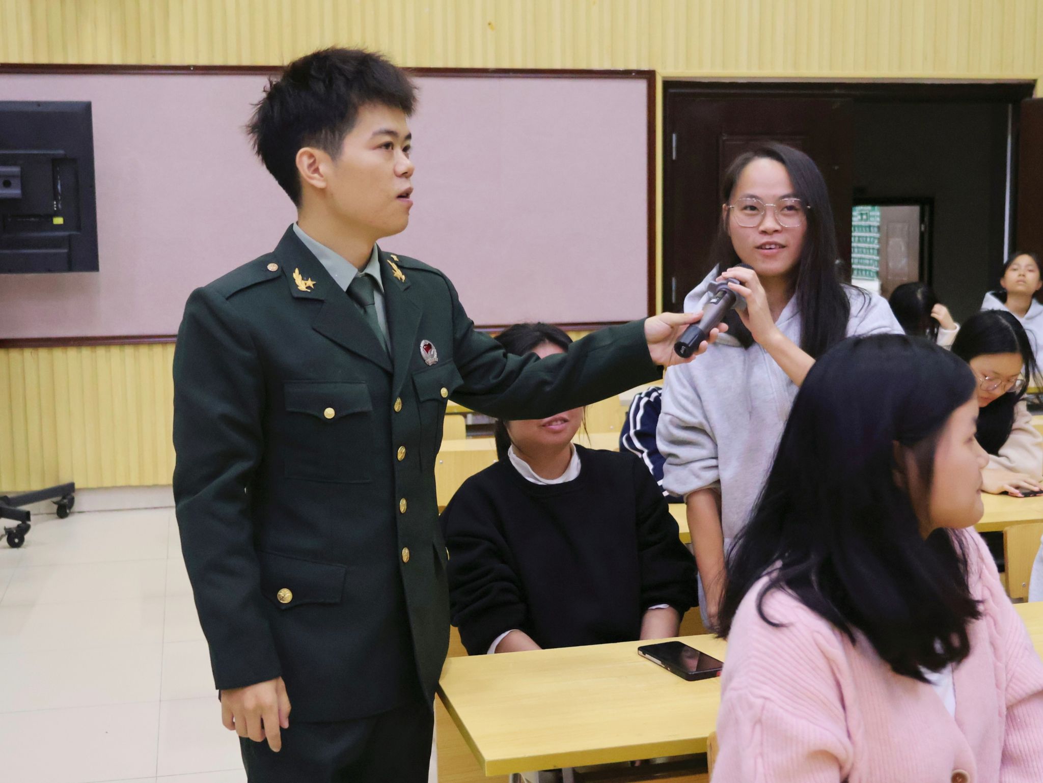 讲座伊始,覃家俊同学结合自身服役经历,以“一种身份、一份岗位、一次蜕变、一次磨炼”为脉络,生动讲述了军旅生涯的成长与感悟。作为一名侦察兵,他始终以“情报大于生命”为座右铭,在艰苦训练中锤炼了坚定的意志品质。随后,他细致解读了退伍士兵在学业深造、就业创业等方面的政策支持,并分享了多位优秀退伍学生的发展路径。接着,钟宗川同学以退伍防化兵的身份,带大家走进“防化尖兵”的世界——从防化兵的历史由来与职能发展,到生化武器的危害及防护知识,他结合真实案例进行通俗讲解,让同学们对国防特殊兵种有了直观认知。他还分享了部队的日常训练与生活点滴,用真挚感受拉近了同学们与军旅生活的距离。最后,覃家俊同学通过互动问答的方式,现场解答了同学们关于年龄限制、专业适配性、心理准备等方面的疑问,气氛和谐而热烈。