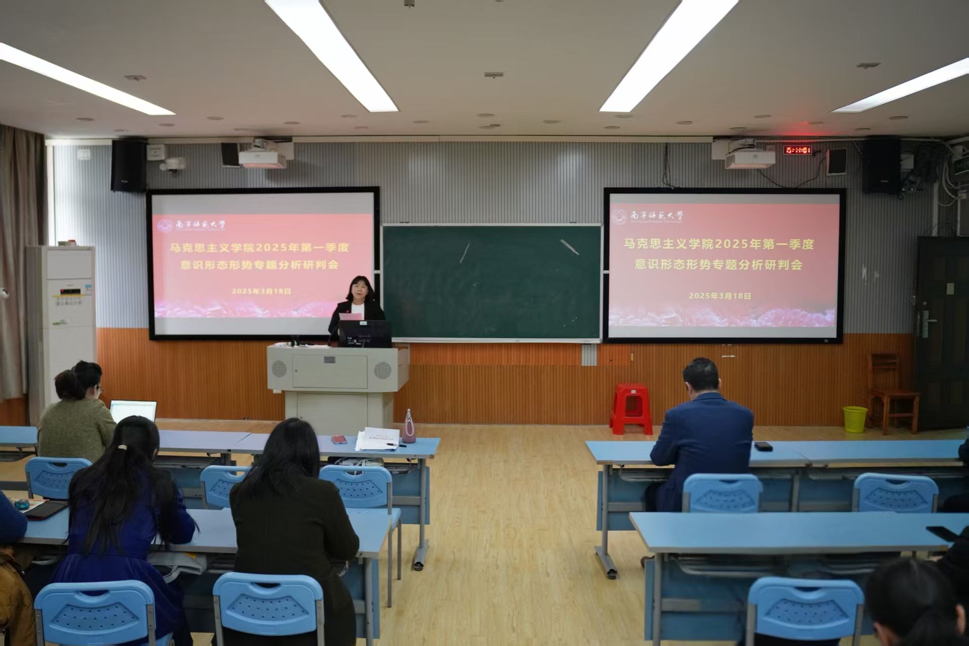 会上,学院党委书记李玲传达了学校2025年第一季度意识形态形势专题分析研判会精神,并对第一季度学院意识形态工作进行全面梳理与剖析。结合学院实际,深入分析在课堂教学、学术研究、师德师风、家风家教等方面可能存在的意识形态风险点,并提出针对性的防范举措。