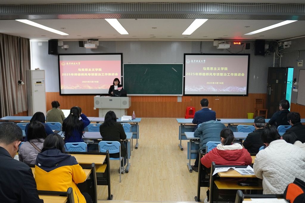 在明秀校区召开师德师风专项整治工作推进会,学院党政领导班子成员及全体教职工参会。
